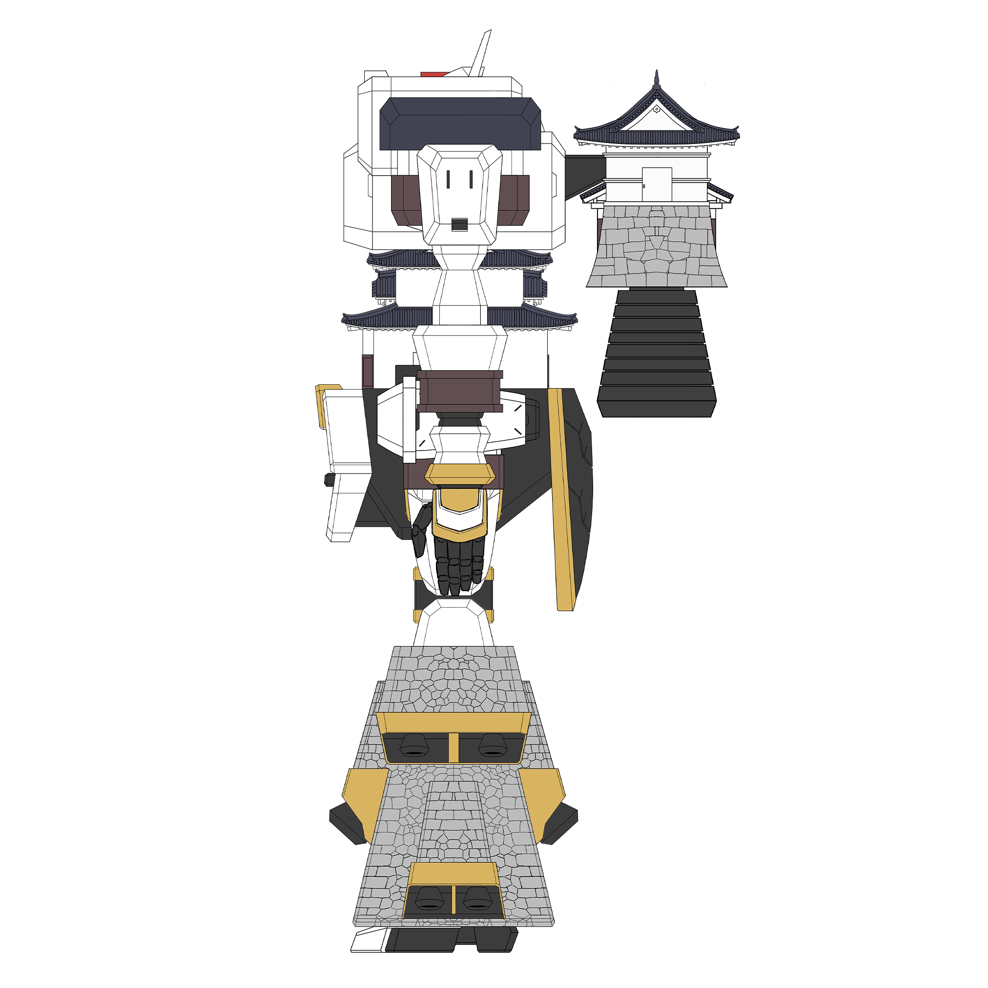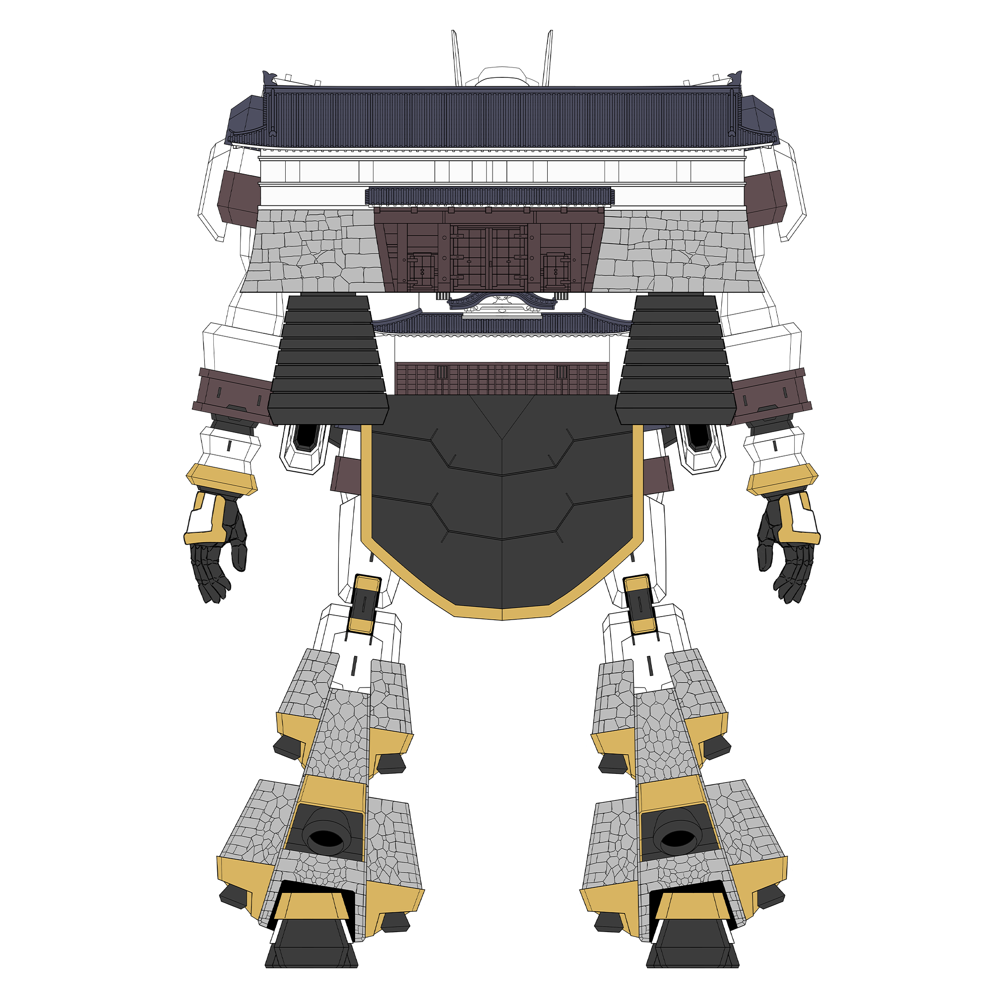 天守からなる胴体は小柄だが、背の巨大ブースター・大手一の門がパワーを、石垣状の脚部スラスターがスピードを実現する。京極家の四つ目結紋を模した両肩の発射口からは、人ならざるものをも断つ無数の刃「幽青斬(ゆうせいざん)」が放たれる! 唯一無二の異彩を放つオシロボット。